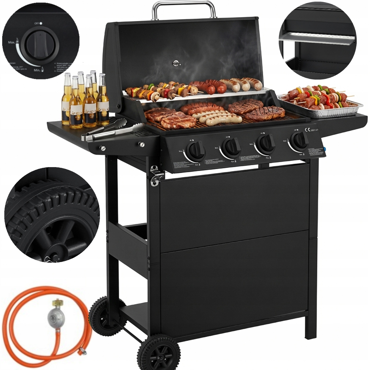 GRILL GAZOWY OGRODOWY LANDGRAF RUSZT MIEJSCE NA BUTLĘ TERMOMETR PÓŁKI Cechy dodatkowe kółka miejsce na butlę pojemnik na tłuszcz pokrywa półka szafka termometr